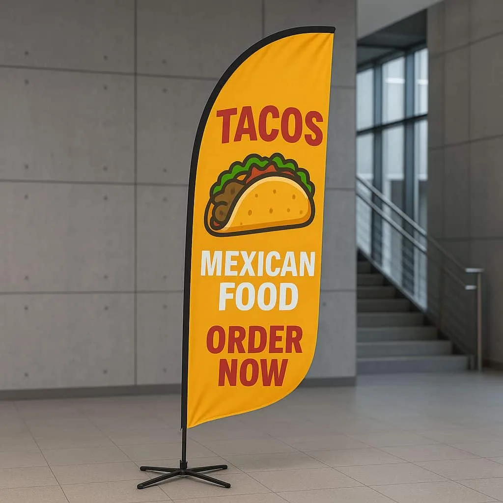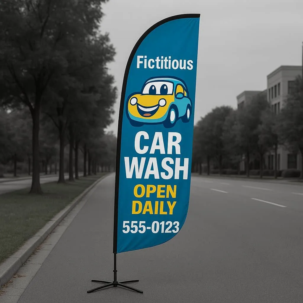 Moreover, the flag’s natural movement helps attract attention from passing traffic. Because of this, your message stays visible even from a distance. You can easily relocate the flag as needed, making it a flexible option for changing promotions.